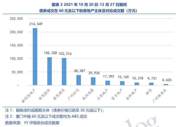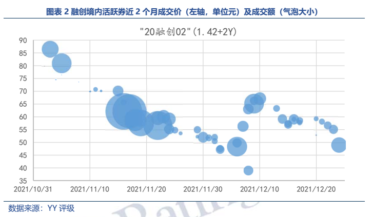 公開信息顯示融創2021年12月有14億元ABS+1.5億元供應鏈ABS到期,2022年一季度有35億元公司債+10億元ABS到期,此外訪談信息顯示一季度到期債務還有77億元貸款+20~30億元信托+境外融資4億元美金(有部分是質押萬達股票)。境內活躍券“20融創02”成交凈價自10月底來一路下跌,12月初在一行兩會表態后有一波上漲,隨后繼續下跌,目前在49元左右。