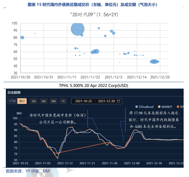 時代中國12月7日對年內所有到期債券及ABS備償完畢,美元債價格對此產生積極反應,但隨后境內外債券又出現下跌,市場猜測為公募機構換倉。考慮到公司舊改業務涉及較多表外融資,透明度較低,不排除存在非公開的非標融資輿情的可能。
