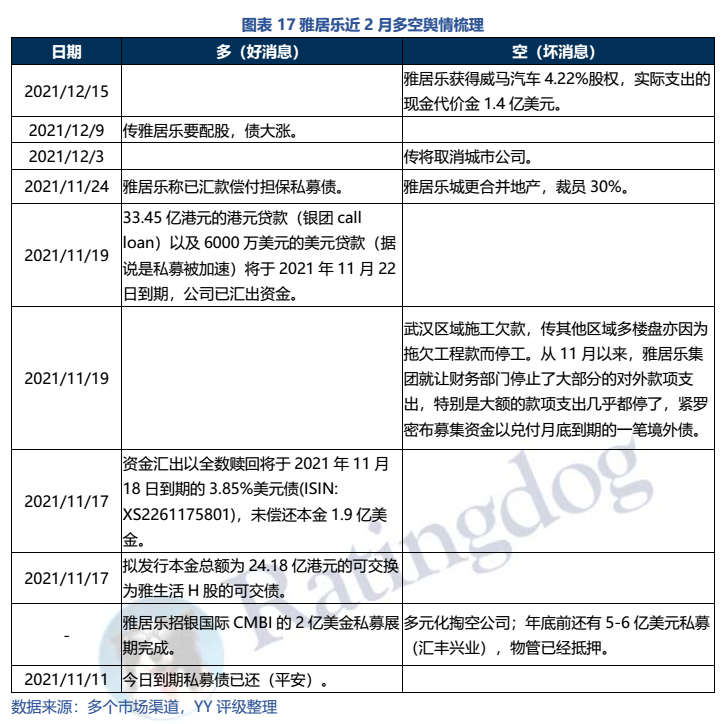 禹洲最臨近的到期公開債務分別是2022年1月的5.79億美元債+4月35億境內債回售+3億供應鏈ABS,近兩個月公司主要的輿情均與再融資相關: