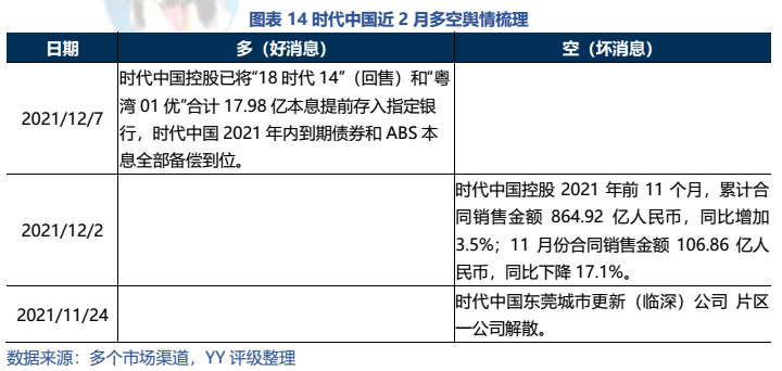 時代中國近兩個月除了還債以外,公開信息未見其他動作。時代中國短期債券到期壓力不大(2022年一季度無境內外債券到期,最臨近到期債券為4月份4.25億境外債),除了11月24日市場傳出東莞城市更新公司某一片區公司解散外,暫未出現其他負面輿情。