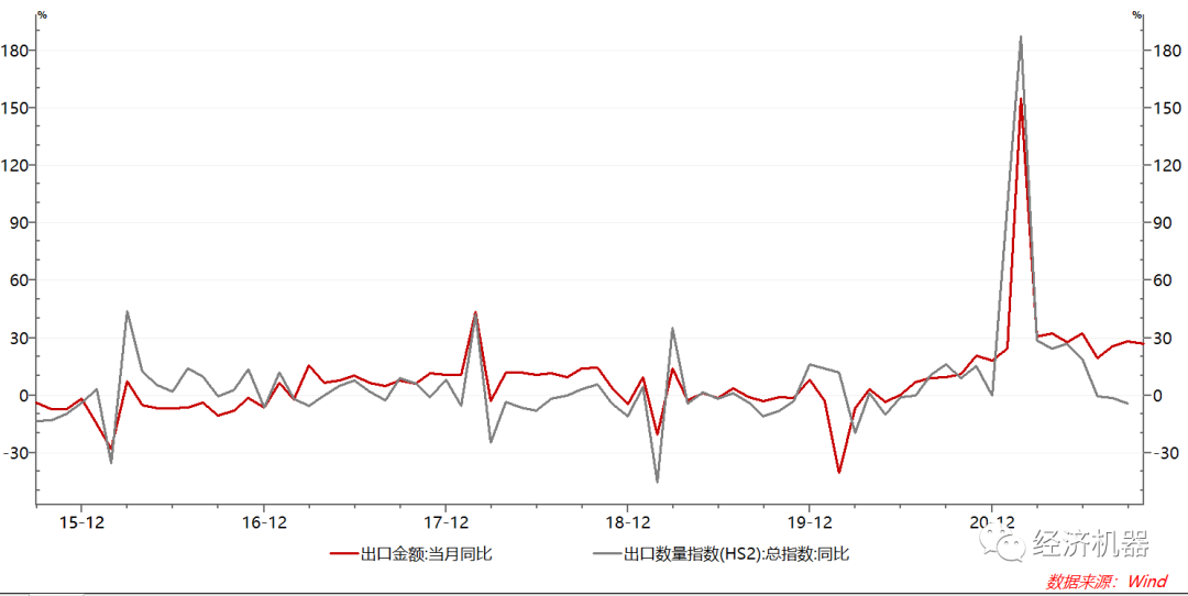 進口弱于預期,部分商品進口量減價升。56.8億美元,環比上月下降9.7%。同比增長20.6%,低于