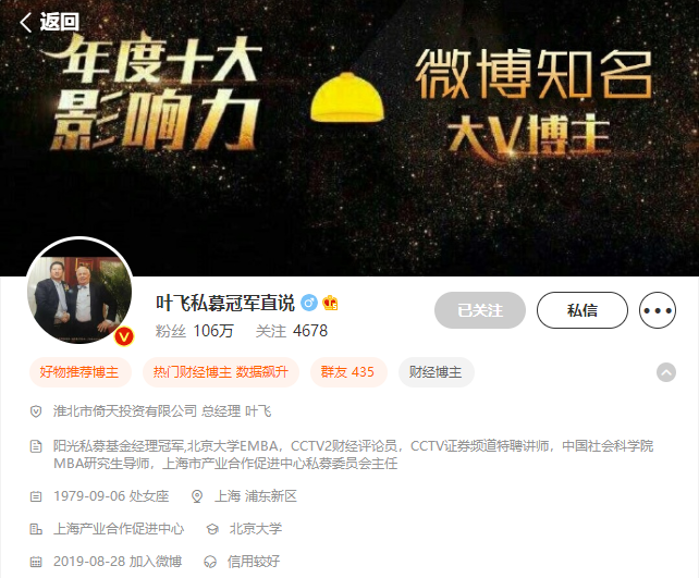 此次連曝猛料的葉飛,其微博認(rèn)證為淮北市倚天投資有限公司總經(jīng)理,在其的介紹中,赫然寫著“陽光私募基金經(jīng)理冠軍、北京大學(xué)EMBA、CCTV2財經(jīng)評論員、CCTV證券頻道特聘講師、中國社會科學(xué)院MBA研究生導(dǎo)師、上海市產(chǎn)業(yè)合作促進(jìn)中心私募委員會主任”。