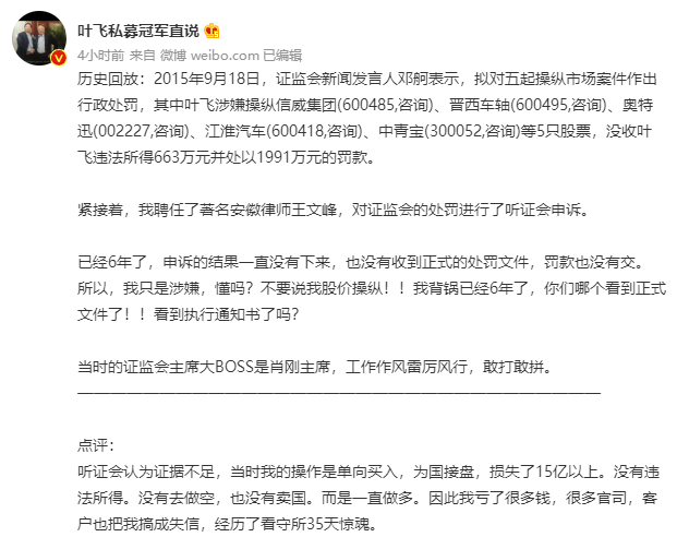 不過對此,葉飛于2021年5月14日在微博回應(yīng)稱,自己當(dāng)時的操作是單向買入,為國接盤,損失了15億以上,沒有違法所得。因此虧了很多錢,攤上很多官司,客戶也把自己搞成失信,但至今正式的處罰文件并未下達(dá),罰款自己也沒交。