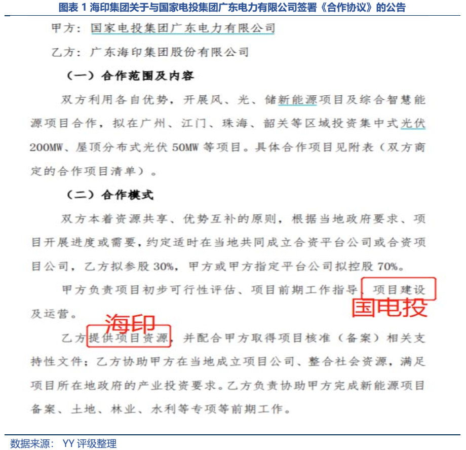 合作模式是由海印提供項目資源、做好前期備案等工作,國電投廣東電力負責光伏電站項目建設及運營。