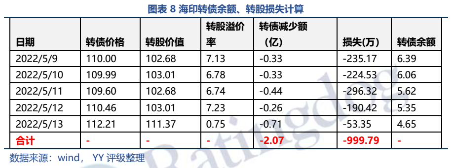眾所周知,海印轉債已經公告到期贖回,存續時間不多了(最后交易日5月23日,到期日6月7號),僅剩9個轉股日、1個交易日。而5月9日至12日轉股溢價率接近7%,轉股后直接賣出必然虧損,3000萬對應的每日虧損在200-300萬左右。