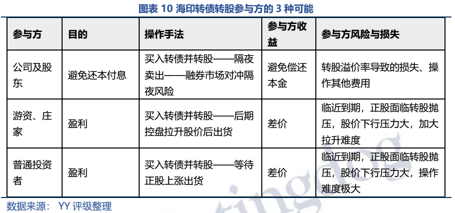 理論上,公司及大股東、游資及莊家、普通投資者都有轉股可能,但是:01海印轉債基本面較差,正股又面臨轉股拋壓,對于投資者而言轉股博弈價值極??;02如果是為了博弈盈利,沒必要同時進行融券對沖;03該操作最大的贏家是公司,可以減小違約困擾,又可以白嫖一大筆資金。
