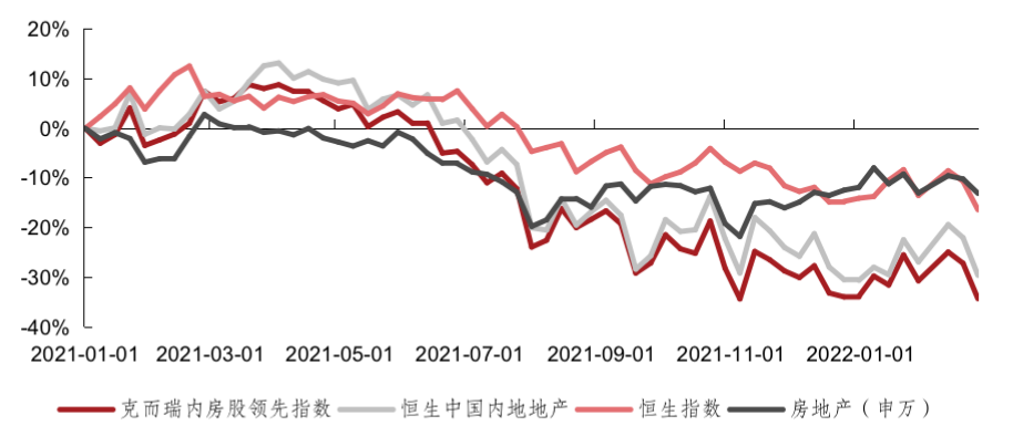 2021年1月1日以來,地產股震蕩下行。截止2月25日,克而瑞內房股領先指數跌幅34.3%,同期恒生中國內地地產指數跌幅29.6%。恒生指數跌幅16.4%,房地產(申萬)板塊跌幅13.1%。