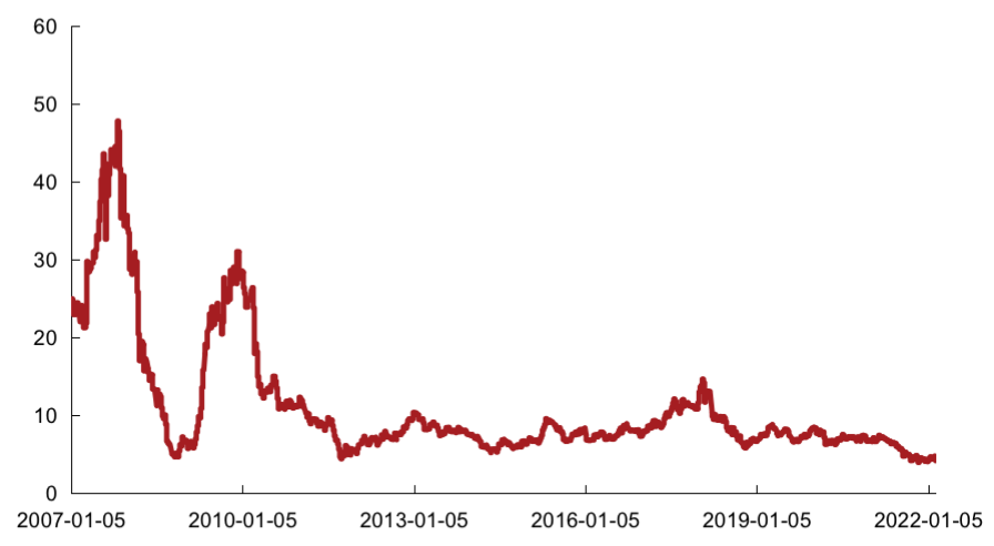 2022年2月相對恒指成分股的PE周均值為-64.4%,微低于上月相對PE周均值-64.3%,低于2021年全年相對PE周均值-61.0%。克而瑞內房股領先指數成分股整體PE 2022年2月周均值為4.58,高于上月周均值4.50,低于2021年全年周均值5.75。