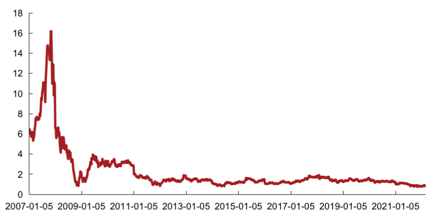 圖:2月克而瑞內房股領先指數成分股相對恒指整體PB小幅上升后繼續回落