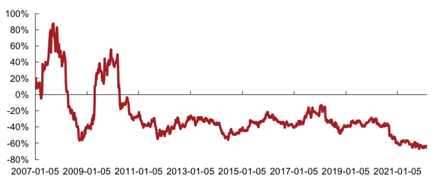 從估值角度看,2022年2月克而瑞內房股領先指數估值在小幅回升后繼續下行,指數相對恒指PE較上月有所回落。