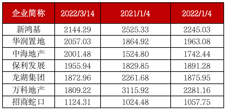表:88家樣本企業中千億市值房企最新市值與2021、2022初對比(單位:億元)