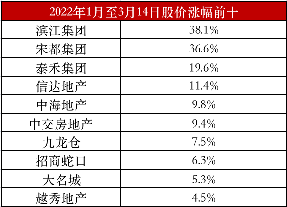表:88家樣本房企2022年1月1日至今股價漲幅情況