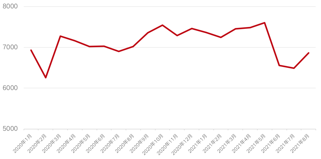2018年,岳陽樓市開始轉冷,市場開啟下行趨勢,四季度時房價由2017年最高9000元/平米降至7000元/平方米左右,價格逐漸回歸穩定,至今年8月房價跌破7000元/平方米。從銷售數據來看,2020年以來,月度成交套數基本維持在1500套左右,今年六七月,受大幅降價影響,成交高位運行,分別成交2228套和2286套,成交價格跌至7000元/平方米以下。