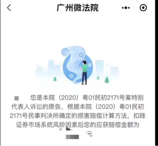 根據廣州中院《關于特別代表人訴訟原告應獲賠償金額查詢方式的公告》,相關投資者可通過搜索進入“廣州微法院”微信小程序,點選頁面下方“微訴訟”欄目,選擇“代表人訴訟”入口進入代表人訴訟平臺,實名認證后,即可對自己的獲賠資格進行查詢,具體操作見下圖: