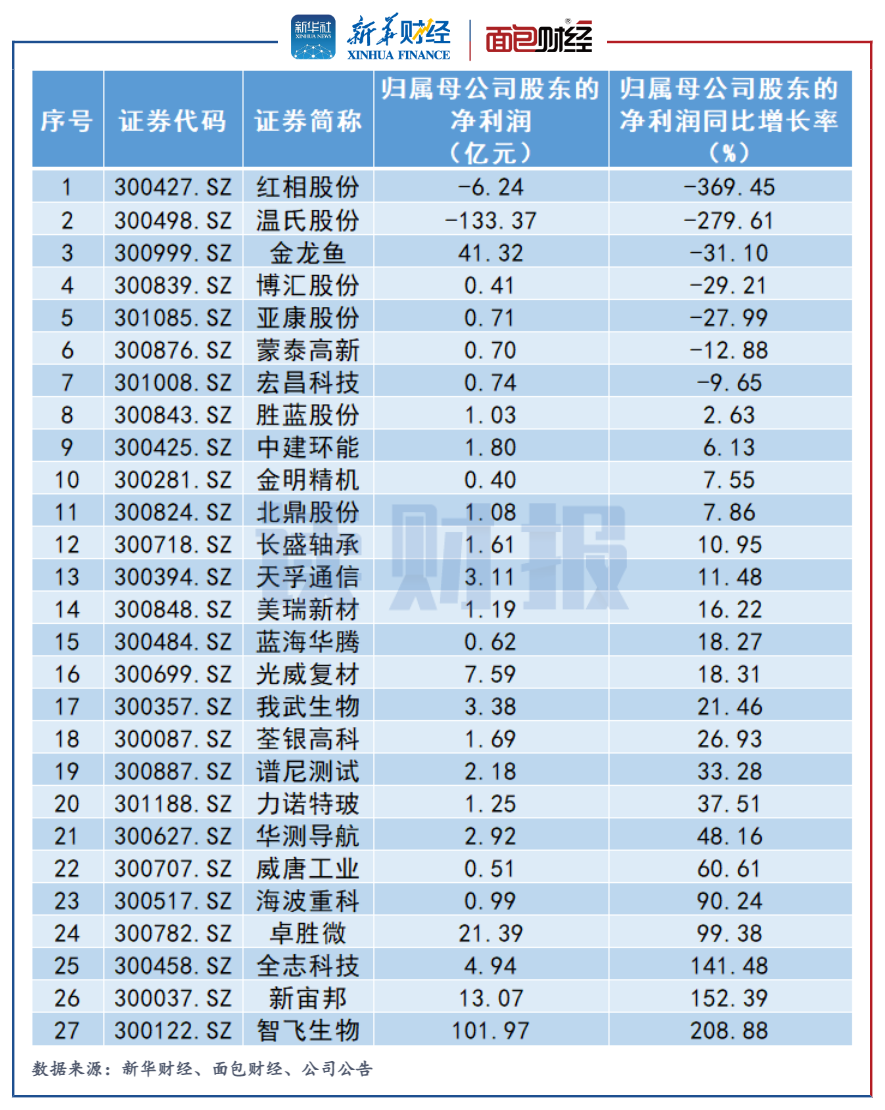 除了業績預告,截至2022年2月23日,創業板上市公司中有27家公司披露了2021年業績快報,其中溫氏股份、紅相股份兩家公司預計虧損。