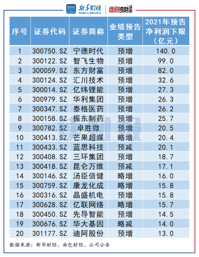 寧德時代、智飛生物和東方財富2021年度預計實現歸母凈利潤下限分別為140億元、99億元、82億元,在創業板上市公司中排前三甲。