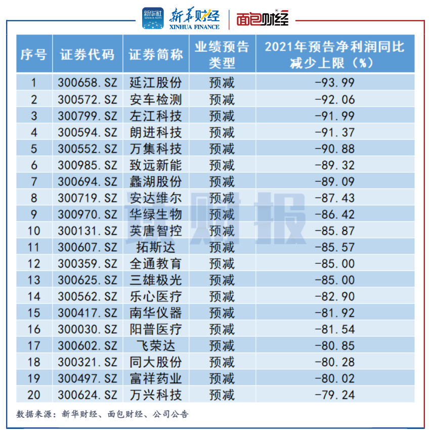已發布業績預告的創業板上市公司中,共有127家2021年度歸母凈利潤預計同比下滑(剔除首虧)。按照預告歸母凈利潤同比下滑上限統計,延江股份、安車檢測、左江科技2021年度歸母凈利潤同比分別下滑93.99%、92.06%、91.99%,是創業板中歸母凈利潤降幅最大的三家公司。