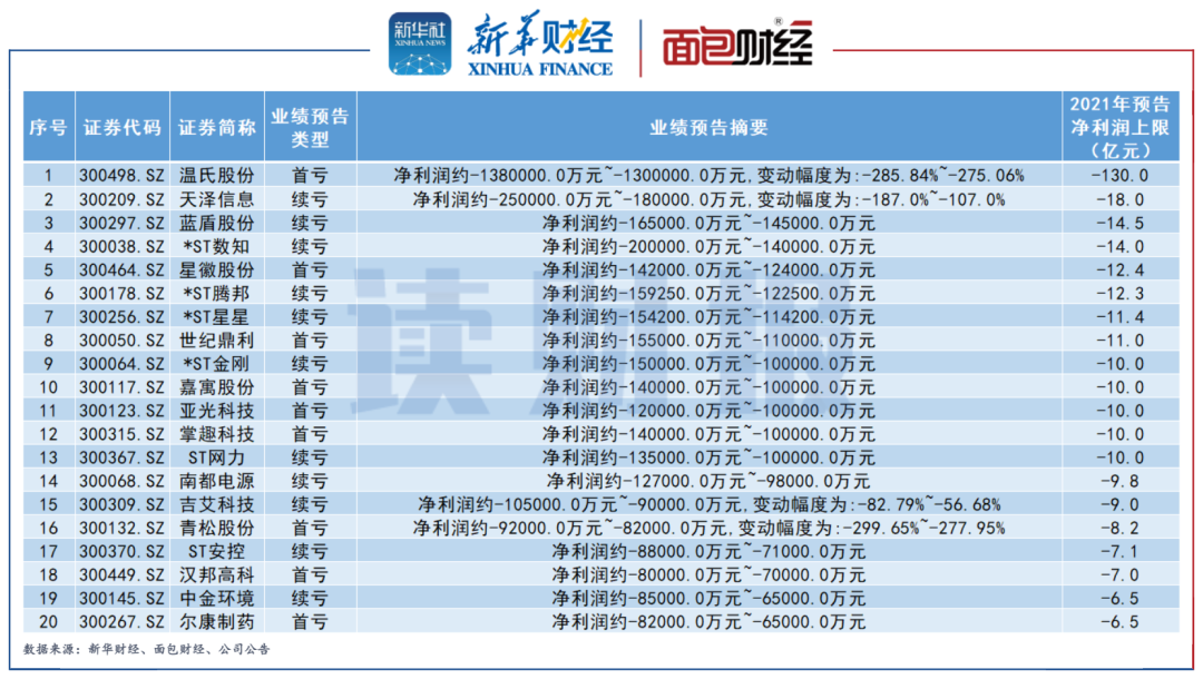 溫氏股份自2015年吸收合并大華農上市至今首次虧損,預計2021年度歸母凈利潤虧損130億元至138億元,成為創業板的“預虧王”。天澤信息、藍盾股份、*ST數知、星徽股份等超過10家公司也預計虧損超過10億元。