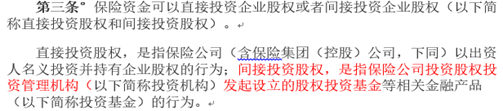 除了債權(quán)以外,保險資金還可以投資地產(chǎn)企業(yè)的股權(quán),其中投資上市公司比較為人所知(比如人壽和大家保險投資遠洋集團、生命人壽投資金地、平安投資華夏幸福以及泰康投資陽光城等),而直接投資非上市地產(chǎn)企業(yè)的股權(quán)是被禁止的,當然這并不能禁止保險資金直接投資非房業(yè)務的股權(quán)。此外,其實還存在一種體量不小的重要投資方式,即間接投資股權(quán)的方式,如下(來自《保險資金投資股權(quán)暫行辦法》):