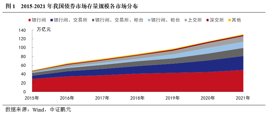 1. 我國債券市場以銀行間市場為主、交易所市場為輔,交易所市場規模占比逐年攀升