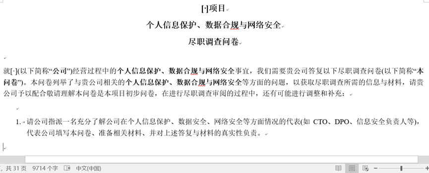 通常情況下,完整的專項數據盡調問卷會涵蓋“個人信息保護”、“數據合規”與“網絡安全”三個部分,如下圖所示,我們常用的主表一共31頁,約9700字,另有其他附件表格配套使用。
