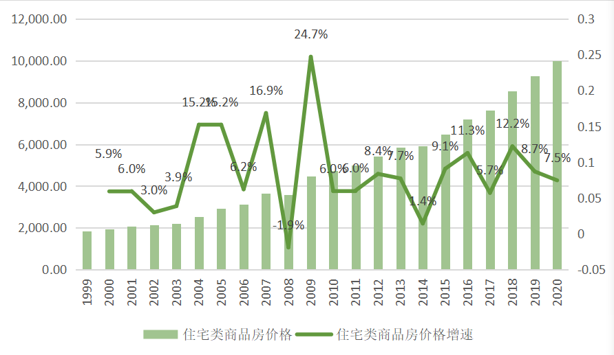 2.“預期紅利”。債務導致的流動性過剩(見《隱性債務與貨幣供給》一文)背景下,投機性需求一直蠢蠢欲動。房價增速在2014年短暫地趨近于0之后(如圖3),又開始以較高增速增長,2015-2020年均增速都在5.7%以上,完美跑贏CPI。再堅定的房價“不漲論者”都被現實打臉,不禁懷疑自己對世界的認知是不是有偏差,再堅定的“佛系者”都不免想跳墻,覺得是否有必要保持佛系而不是去投一把資或者投一把機。我們不能說買N套房才是投資或投機,經濟學注重邊際分析,以前買30平米滿足需求,在生命周期內平衡好了吃穿住行等支出用度,現在預期改變,買到31平米,那多出的1平米就是廣義的投資或投機。投資或投機不是貶義詞,持幣、儲蓄或持有其他類型資產都是資產配置上的選擇而已。