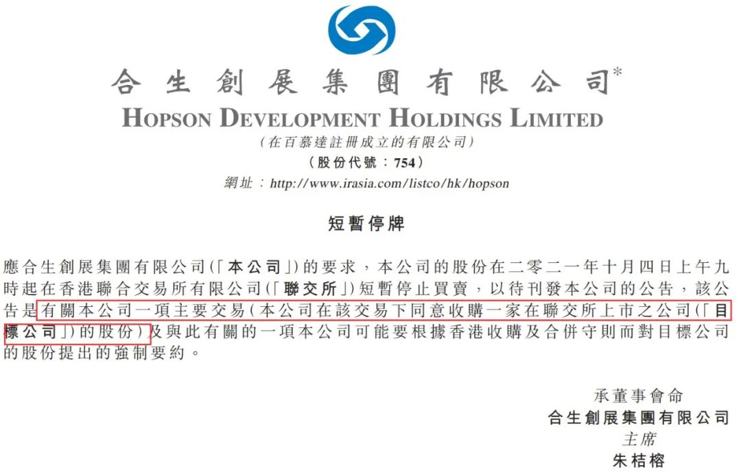 同日,合生創展亦短暫停牌并公告:是有關本公司一項主要交易(本公司在該交易下同意收購一家在聯交所上市之公司的股份)……