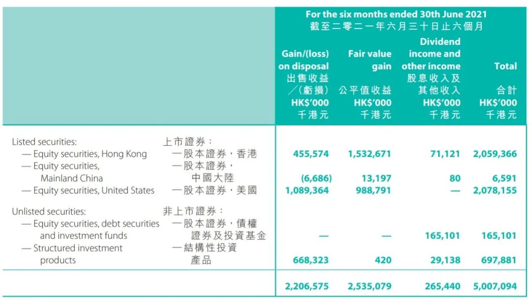 2021上半年,合生創展按公平值透過其他全面收入列賬的財務資產為41.03億港元;按公平值透過損益列賬的財務資產為287.87億港元。于一級市場及二級市場之投資收入為50.07億港元。