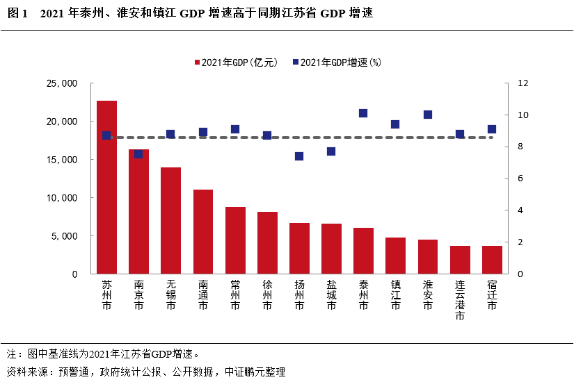 2021年蘇州、南京和無錫GDP規(guī)模繼續(xù)處于領(lǐng)跑地位,但泰州、淮安和鎮(zhèn)江GDP增速高于同期江蘇省GDP增速。2021年江蘇省13個地級市GDP規(guī)模均有所提升,但排位順序未發(fā)生變化。從GDP規(guī)模看,2021年GDP規(guī)模突破萬億的地級市依舊是蘇州、南京、無錫和南通,數(shù)量較2020年無變化。2021年,蘇州、無錫和南京GDP總和占江蘇省GDP的45.61%,較2020年下降0.49個百分點。蘇北地區(qū)中宿遷、連云港和淮安GDP規(guī)模依舊偏弱,依舊處于省內(nèi)最后三位。從GDP增速來看,2021年由于疫情得到有效控制,各地級市GDP增速均高于2020年。2021年,南京、揚(yáng)州和鹽城GDP增速低于同期江蘇省GDP增速,泰州、淮安和鎮(zhèn)江雖然廣義債務(wù)負(fù)擔(dān)較重,但2021年GDP增速明顯高于同期江蘇省GDP增速,其余地級市GDP增速基本和江蘇省GDP增速持平。