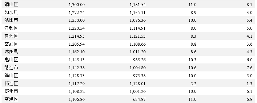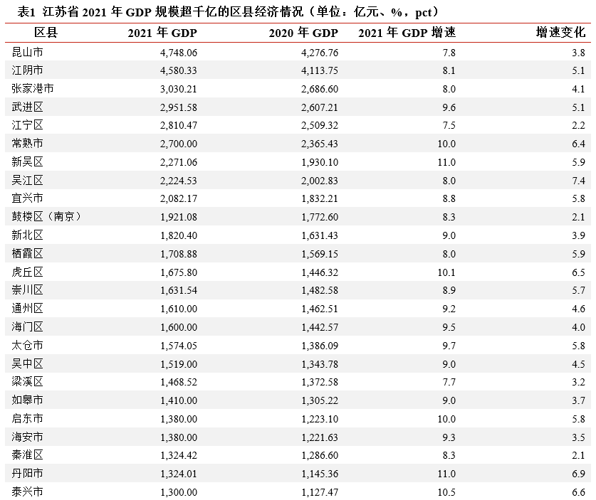 2021年除邗江區(qū)外,江蘇省其他各區(qū)縣GDP規(guī)模均有所提升,響水縣GDP增速下滑0.1個百分點。2021年江蘇省各區(qū)縣GDP規(guī)模大多處于增長狀態(tài),其中昆山、江陰和張家港市GDP規(guī)模仍處于頭部位置,且2021年張家港GDP突破三千億大關(guān),新吳區(qū)和宜興市則突破兩千億大關(guān)。但邗江區(qū)2021年GDP下滑10.72億元至1,117.29億元。GDP增速方面,除盱眙縣、沛縣、贛榆區(qū)和豐縣未獲得GDP增速外,2021年江蘇省大部分區(qū)縣GDP增速均高于2020年,但響水縣GDP增速下滑0.1個百分點至6.0%。