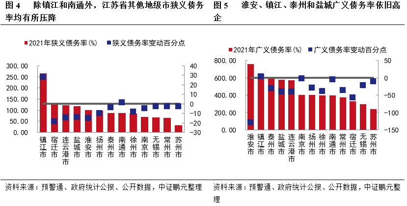 除南通和鎮(zhèn)江外,2021年江蘇省各地級市狹義債務(wù)率【2】均有所壓降;2021年淮安、鎮(zhèn)江、泰州和鹽城廣義債務(wù)率依舊較大。2021年鎮(zhèn)江債務(wù)壓力依舊較大,當(dāng)年末鎮(zhèn)江狹義債務(wù)率增加27.91個百分點至265.59%,位于各地級市首位,廣義債務(wù)率亦高企,鎮(zhèn)江化債壓力依舊較大。從狹義債務(wù)率壓降看,宿遷壓降力度最大,2021年宿遷狹義債務(wù)率較2020年末下降18.44個百分點;其次,2021年淮安、鹽城和連云港狹義債務(wù)壓降力度均在10個百分點以上。廣義債務(wù)率方面,2021年淮安、鎮(zhèn)江、泰州和鹽城廣義債務(wù)率排名較2020年無變化,依舊位于江蘇省各地級市前列。
