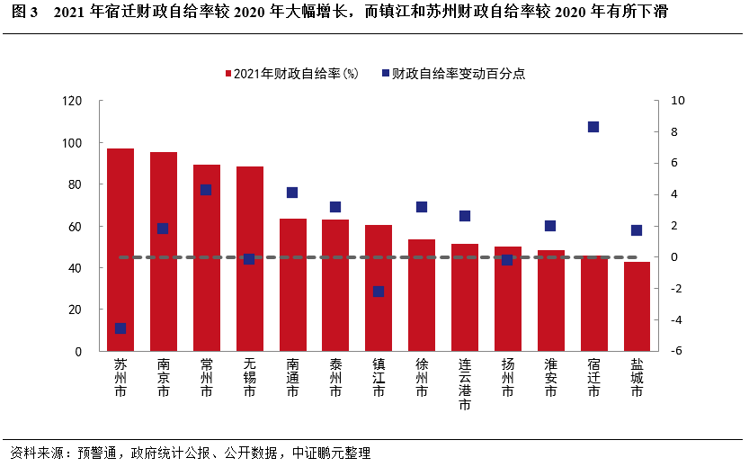 財政自給率方面,2021年蘇州和鎮(zhèn)江財政自給率較2020年分別下滑4.59個百分點、2.20個百分點至97.15%和60.29%,無錫和揚(yáng)州財政自給率基本和2020年持平,宿遷財政自給率提升較為明顯,2021年宿遷財政自給率上升8.28個百分點至45.80%,主要系2021年宿遷綜合財力較2020年增加明顯,且一般公共預(yù)算支出變動不大所致。