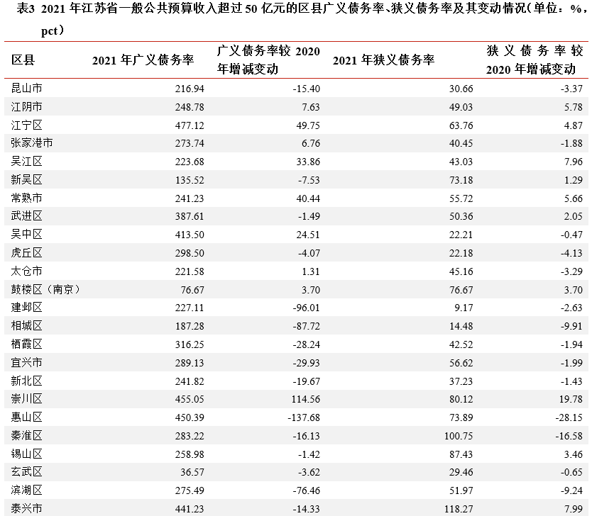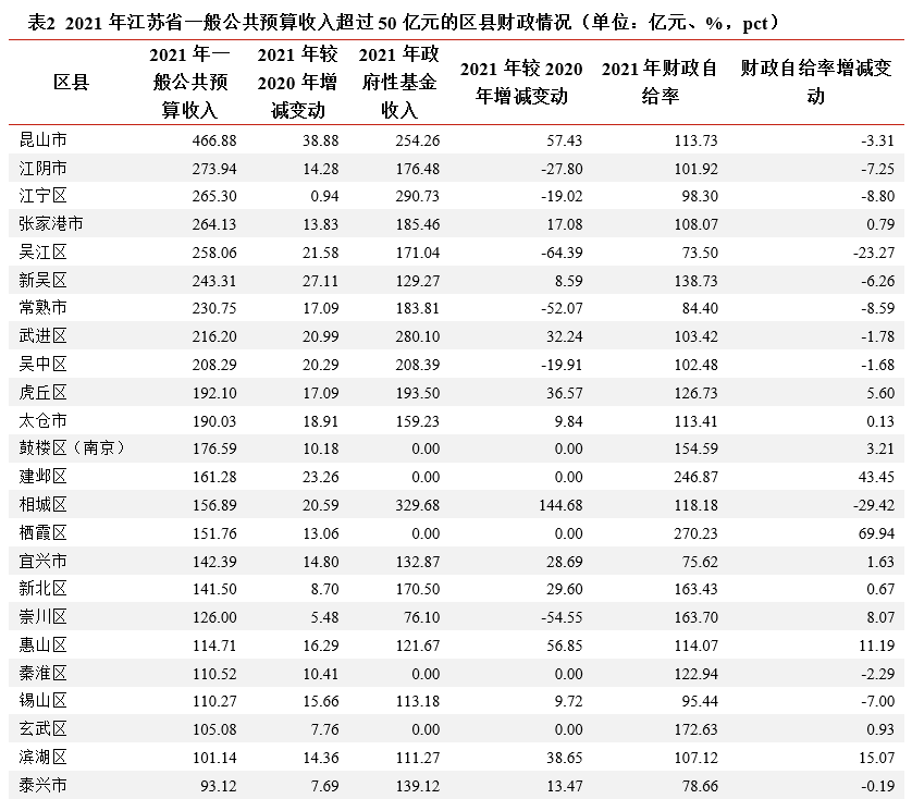 2021年江蘇省絕大部分區(qū)縣一般公共預(yù)算收入較2020年均有增長,但18個區(qū)縣政府性基金收入下滑,33個區(qū)縣財政自給率表現(xiàn)弱于2020年。一般公共預(yù)算收入方面,2021年昆山、江陰和江寧區(qū)一般公共預(yù)算收入仍穩(wěn)居頭部,邗江區(qū)一般公共預(yù)算收入較2020年下滑5.70億元至54.41億元。受2021年房地產(chǎn)市場疲軟影響,2021年江蘇省有18個區(qū)縣政府性基金收入較2020年有所下滑,其中吳江區(qū)下滑幅度最大,當(dāng)年政府性基金收入下滑64.39億元至171.04億元。2021年崇川區(qū)、常熟市和江陰市政府性基金收入較2020年分別下滑54.55億元、52.07億元和27.80億元。財政自給率方面,2021年江蘇省95個區(qū)縣中有33個區(qū)縣財政自給率表現(xiàn)弱于去年,相城區(qū)、京口區(qū)、天寧區(qū)、吳江區(qū)和鐘樓區(qū)財政自給率較去年同期下降20個百分點以上。