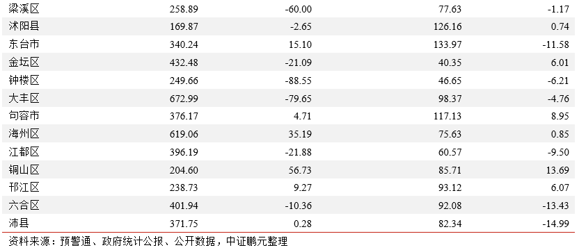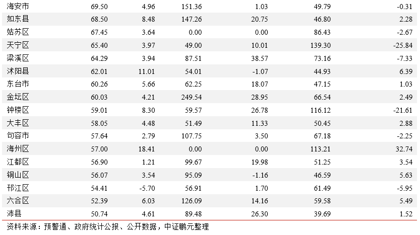 財政情況:2021年宿遷財政自給率大幅提高,95個區(qū)縣中有33個區(qū)縣財政自給率表現(xiàn)弱于去年。2021年江蘇省各地級市一般公共預(yù)算收入和政府性基金收入均較2020年有所提高,2021年宿遷財政自給率表現(xiàn)亮眼,較2020年提高8.28個百分點至45.80%,蘇州、南京、常州和無錫經(jīng)濟(jì)實力依舊較強(qiáng)、財政自給率依舊較高。區(qū)縣層面,2021年江蘇省絕大部分區(qū)縣一般公共預(yù)算收入和政府性基金收入均有所增長,昆山、江陰和江寧區(qū)一般公共預(yù)算收入仍穩(wěn)居頭部,但2021年邗江區(qū)一般公共預(yù)算收入下滑5.70億元至54.41億元,吳江區(qū)政府性基金收入下滑64.39億元至171.04億元,相城區(qū)、京口區(qū)、天寧區(qū)、吳江區(qū)和鐘樓區(qū)財政自給率較去年同期下降20個百分點以上。