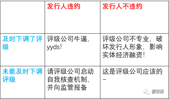 因為債券一旦違約,發(fā)行人的外評是直接掉到CCC及以下,而往上推3個子級,意味著如果不能在違約前將評級符號下調(diào)到BBB,都是失職的。現(xiàn)在能在發(fā)行人首次違約前,將其評級下調(diào)到BBB的評級公司還是鳳毛麟角。