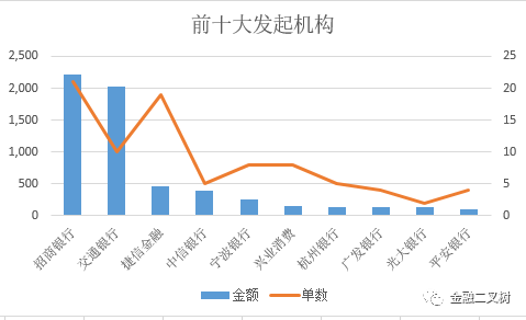 再來看個(gè)人消費(fèi)貸ABS,個(gè)人消費(fèi)貸ABS的發(fā)行機(jī)構(gòu)主要為商業(yè)銀行及持牌消費(fèi)金融機(jī)構(gòu),前十大發(fā)行機(jī)構(gòu)如下圖所示。