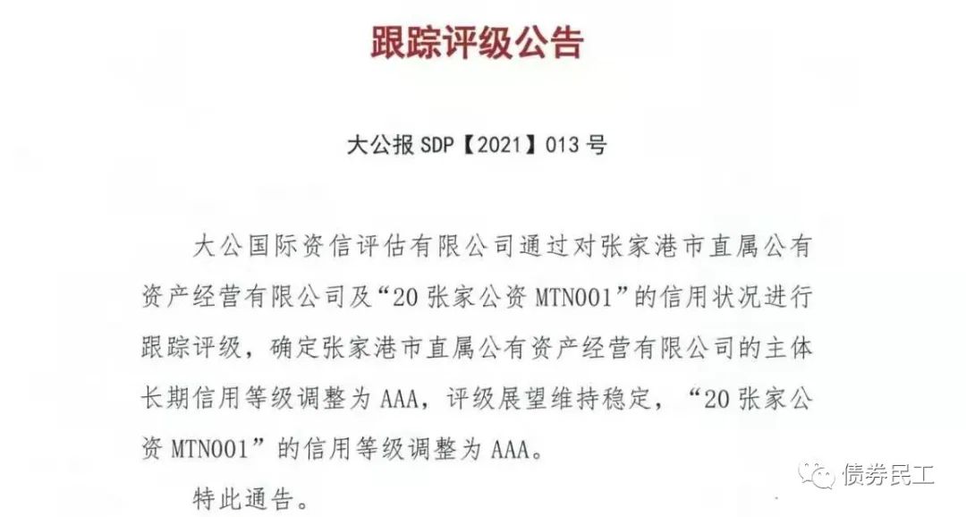 根據(jù)大公國際2021年6月3日披露的跟蹤評級公告,將張家港市直屬公有資產(chǎn)經(jīng)營有限公司的主體長期信用等級由AA+調(diào)整為AAA,成為2021年第3個主體信用評級調(diào)升至AAA的發(fā)行人,也是2021年唯一一個主體主體信用評級調(diào)升至AAA的城投公司。