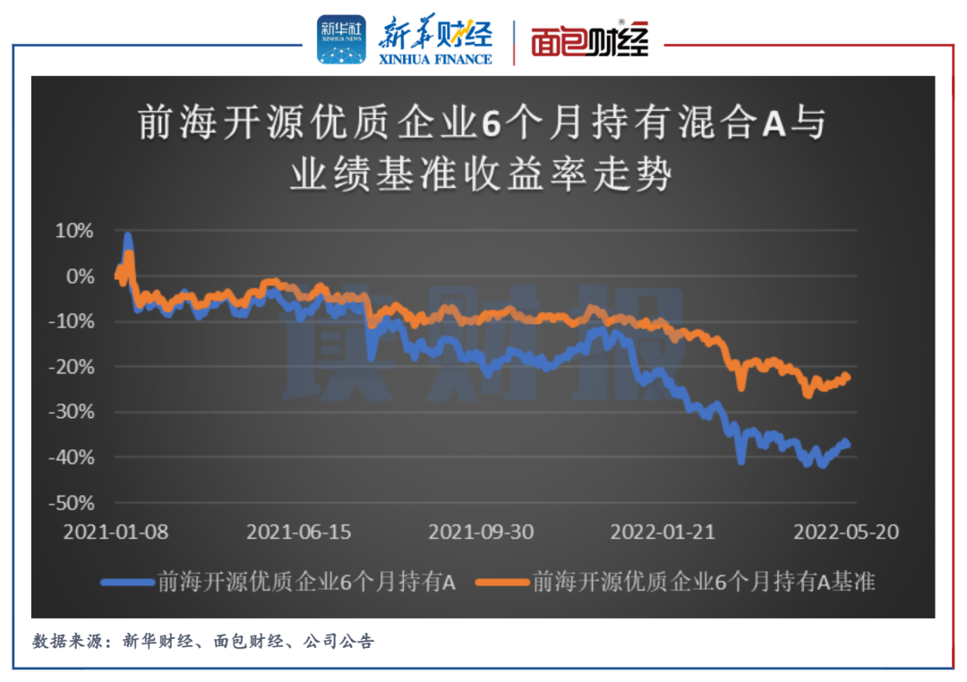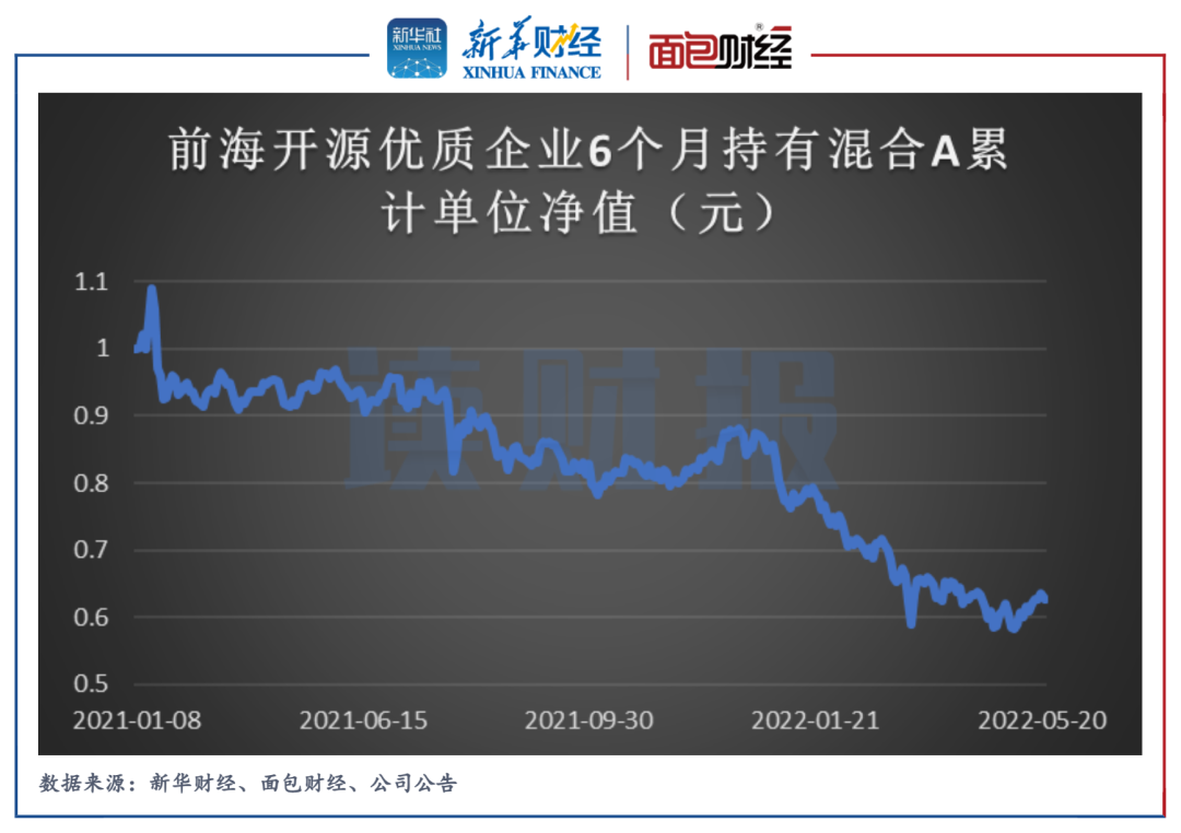 截至2022年5月23日,前海開源優(yōu)質企業(yè)6個月持有混合A的單位凈值回升至0.6273元,年內回撤26.83%,在新華分類偏股型混基中排名2685/2896;成立以來最大回撤達到46.62%,累計跑輸基準近15個百分點。