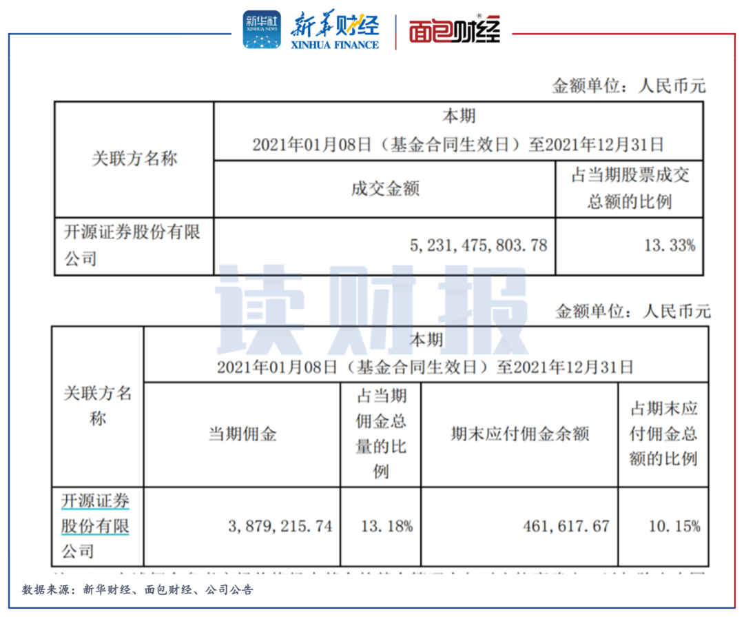 另外,基金2021年年報中提及,前海開源優(yōu)質企業(yè)6個月持有混合約52.31億元的股票成交通過關聯(lián)方開源證券交易單元進行,占當期股票成交總額的13.33%;當期應支付給開源證券的傭金達到387.79萬元。公開資料顯示,開源證券為前海開源四大股東之一,持有公司25%股份。