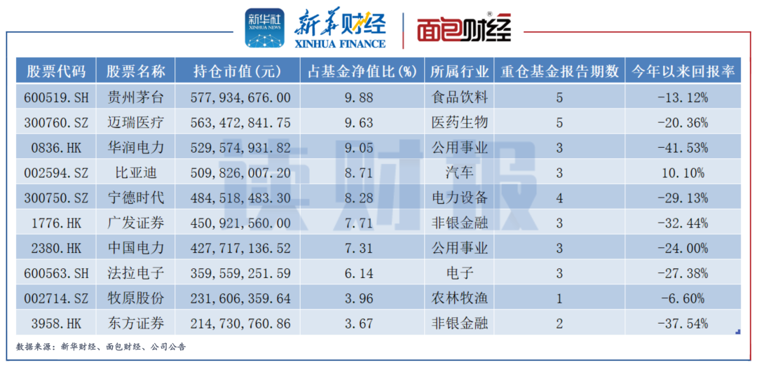 具體持倉來看,該基金重點配置了A股和港股中食品飲料、新能源、醫(yī)療、金融、電力運營等方向的頭部標的,其中貴州茅臺、邁瑞醫(yī)療兩只股票從成立以來一直持有,當前持倉比例均接近基金資產凈值的10%。