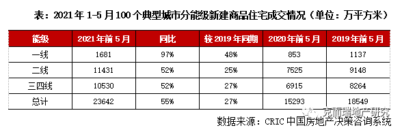 CRIC數(shù)據(jù)統(tǒng)計顯示,全國100個典型城市2021年1-5月商品住宅成交面積合計23642萬平方米,同比增長過半,較之2019年同期增長27%。