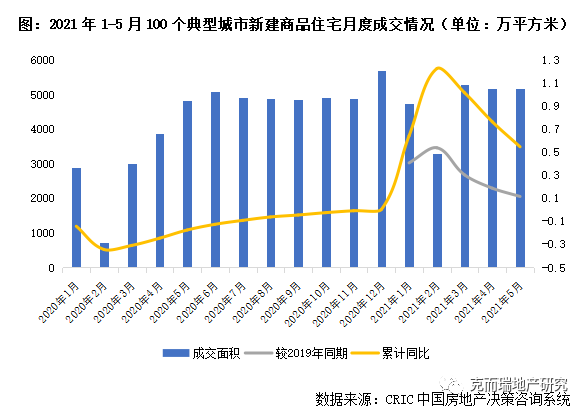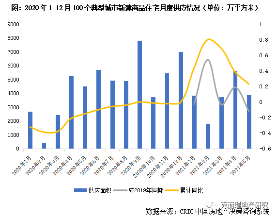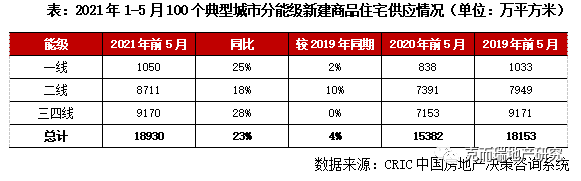 據(jù)CRIC統(tǒng)計,2021年1-5月全國100個重點城市商品住宅新增供應(yīng)面積18930萬平方米,同比增長23%,相較2019年同期增長4%。