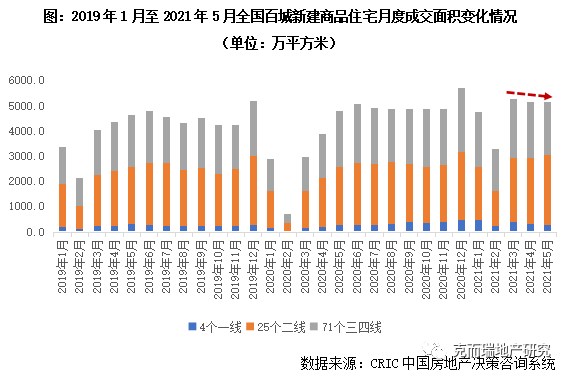 2021年開年以來,狹義庫存除2月顯著跳減之外,一直延續(xù)高位震蕩態(tài)勢。據(jù)CRIC監(jiān)測數(shù)據(jù),2021年5月百城商品住宅庫存量達(dá)到了56926萬平方米,環(huán)比微降1%,同比增長2%。“金三銀四”銷售旺季已過,5月房企推盤積極性略有回落,環(huán)比4月下降三成;成交熱度延續(xù),整體成交量與“銀四”基本持平:一線、三四線城市同環(huán)比齊降,需求釋放后略有回落;二線城市市場熱度穩(wěn)步回升,同環(huán)比齊增,顯著好于去年同期。總體來看,成交量略高于供應(yīng)量,狹義庫存小幅微降。