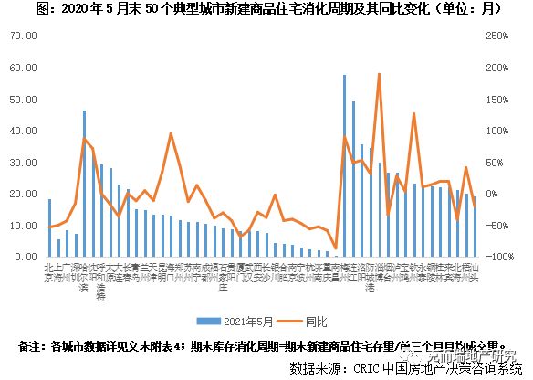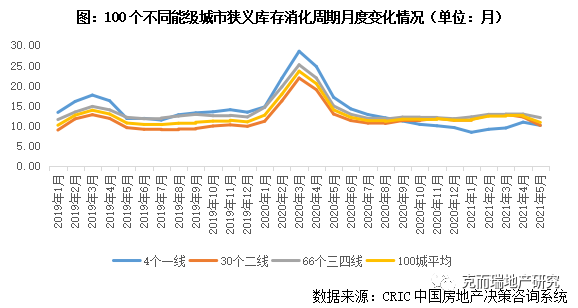 縱觀2021年上半年百城消化周期變動趨勢,1-4月基本在12個月左右持穩(wěn),5月得益于狹義庫存微降,成交熱度延續(xù),與上月基本持平,去化周期穩(wěn)中有降,由2021年4月末的12.34個月微降至10.79個月,顯著低于2020年同期水平。