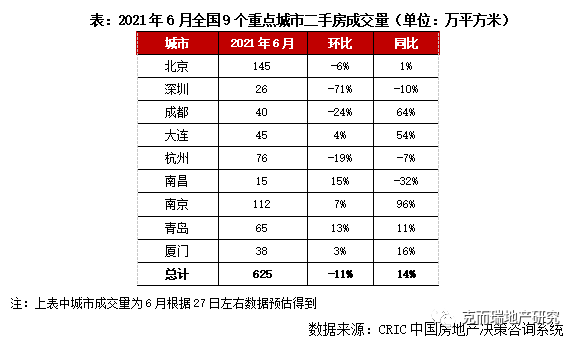 二季度末,各省市成交規(guī)模持續(xù)走低,經(jīng)歷“小陽春”市場顯著放量,年中市場逐漸恢復(fù)理性,月成交規(guī)模穩(wěn)步“三連降”。整體來看,6月全國9個重點城市二手房成交體量為625萬平方米,環(huán)比回落11%,同比仍有14%增幅。