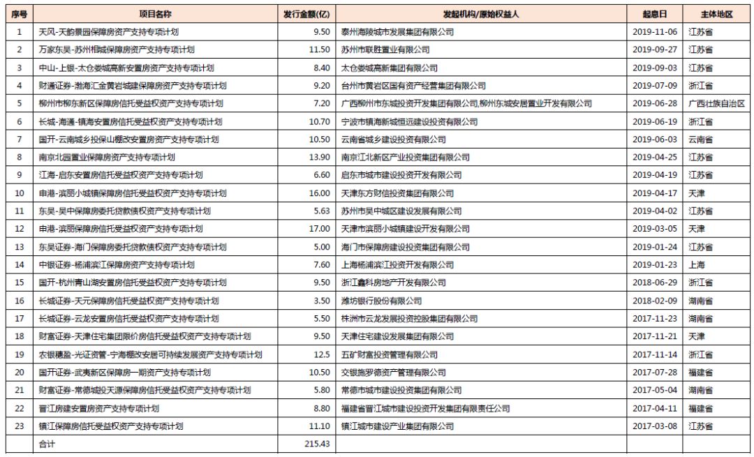 2017年至今,市場共成功發(fā)行23單保障性住房ABS,總募集資金規(guī)模為215.43億元,項(xiàng)目明細(xì)如下: