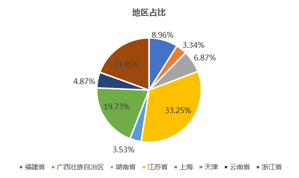 通過下圖可以發(fā)現(xiàn),2019年保障性住房ABS較過往幾年出現(xiàn)了非常大的增長,截至2019年11月末,發(fā)行金額已經(jīng)超過過去兩年之和。在地區(qū)分布方面,江蘇、浙江和天津位列前三,三個地區(qū)占比已經(jīng)超過70%。
