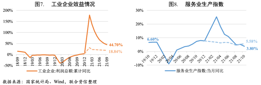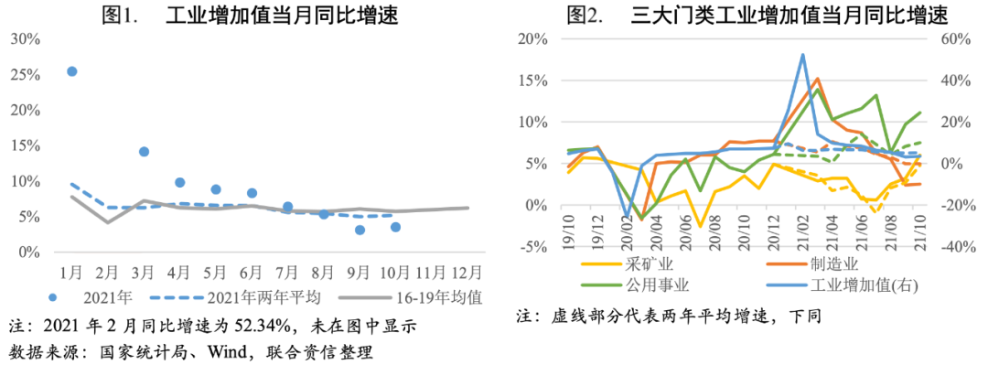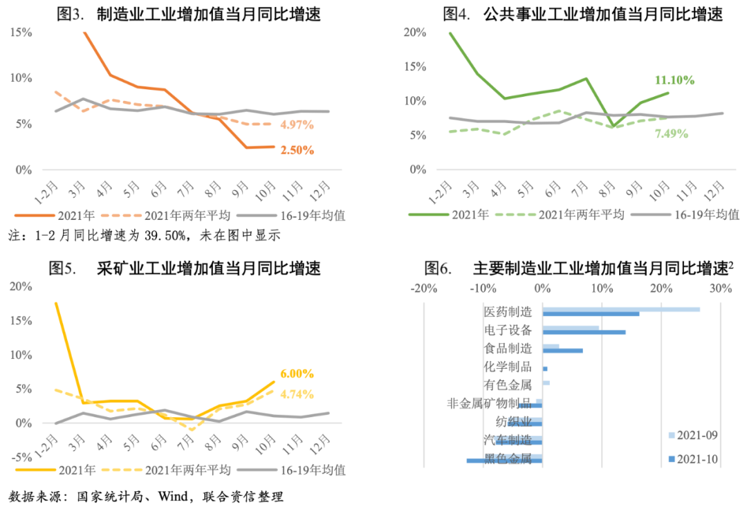 主要行業方面,10月醫藥制造業工業增加值仍保持15%以上的較快同比增速,但增速較上月有所回落;受季節性需求增加、為電商促銷和海外圣誕季積極備貨等因素帶動,電子設備制造、食品制造等行業工業增加值同比增速提升明顯;非金屬礦物制品、黑色金屬冶煉及壓延加工業、汽車制造業、紡織業工業增加值同比增速繼續下滑,其中非金屬礦物制品、黑色金屬冶煉及壓延加工業主要受到環保限產、地產端降溫的影響,汽車制造產能擴張承壓仍然主要受限于芯片短缺因素,紡織業主要是上年同期基數較高所致。