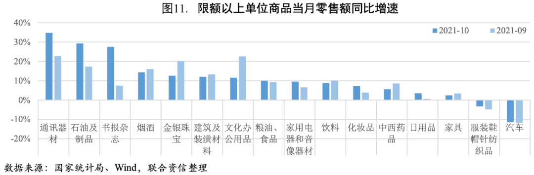 商品零售小幅增加,餐飲收入增速小幅回落。10月商品零售同比增速較上月上升0.7個百分點至5.20%,增速仍低于疫情前水平。汽車消費繼續負增長,是拖累商品零售的一大因素;通訊器材、石油及制品和書報雜志增速均在25%以上,且較上月顯著增長;服裝鞋帽針紡織品零售額增速降幅雖有收窄但依然為負。餐飲收入增速小幅回落,餐飲收入增速較9月下降1.1個百分點至2.00%,預計11月受疫情影響,餐飲收入增速會有所下降。
