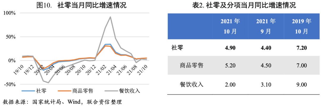 國慶假期效應提振消費,但疫情和天氣因素制約修復進程。2021年10月社會消費品零售總額(下稱“社零”)增長4.90%,連續第二個月回升;環比增長0.43%,較上月小幅提升。社零同比和環比增速小幅回升主要是受益于國慶假期消費帶動,同時價格因素也是推升社零增速的原因之一。但天氣以及疫情制約社零的修復,社零同比和環比增速較疫情前水平尚有修復空間。預計11月電商促銷活動疊加失業率下降帶來的居民可支配收入的增加將繼續提振消費,但十月下旬以來多地疫情散發將拖累消費修復。